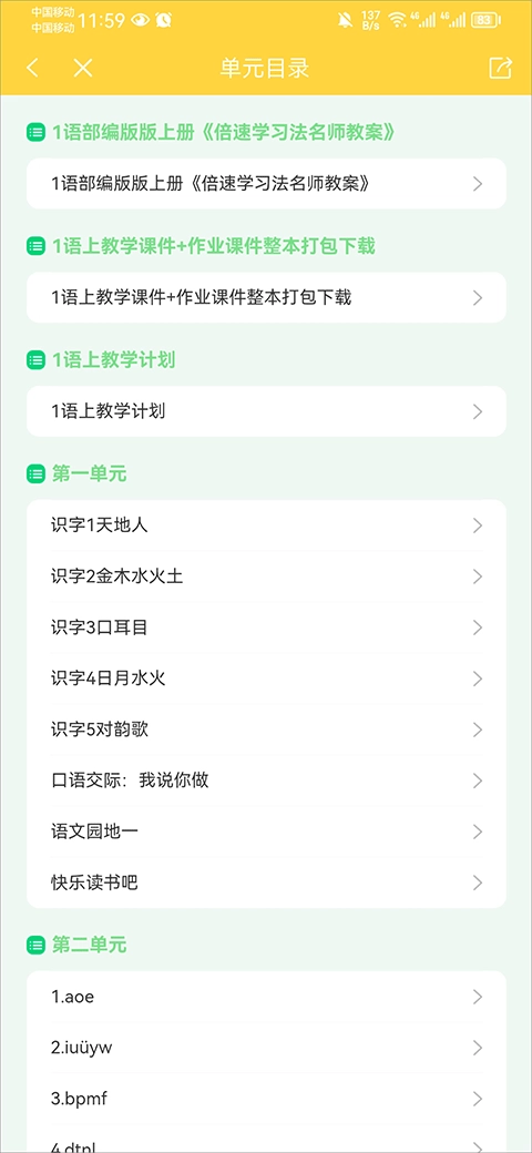 选择完成后,你就会进入该课本的单元目录页面,在这里可以随意挑选任意一个单元章节的资料。