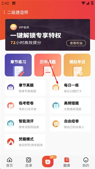 在题库页面,点击“每日一练”选项,即可进入每日一练页面。