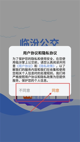 打开临汾掌上公交后,在弹出的【用户协议和隐私协议】弹窗中,点击【同意】按钮,进入应用主界面。