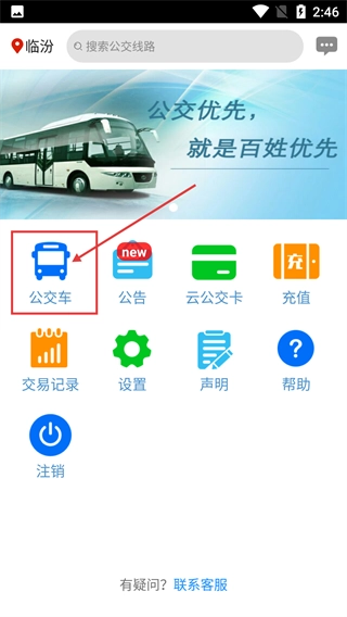 进入主界面后,点击【公交车】选项,就能进入公交查询相关的功能页面。