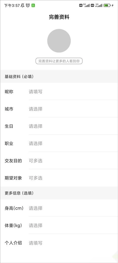 接下来你要完成资料填写,比如头像、昵称、所在城市、交友目的这类信息。