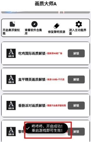 打开画质大师A软件后,大家可以挑选需要优化画质的游戏,选好游戏后点击旁边的“解锁”按钮即可。