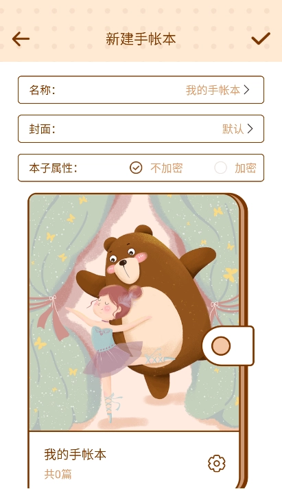 你可以创建多个手帐本,还能给每个手帐本设置隐私密码,把不同的心情放进不同的本子里记录,快来试试吧!