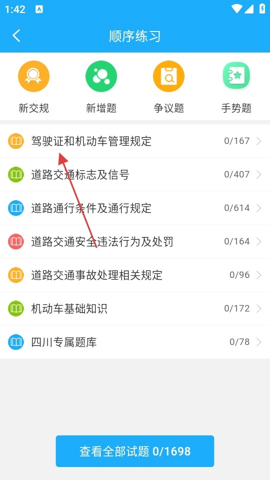 在分类页面,挑选想练习的知识点类别(比如“驾驶证和机动车管理规定”),就能进入题目练习页面。
