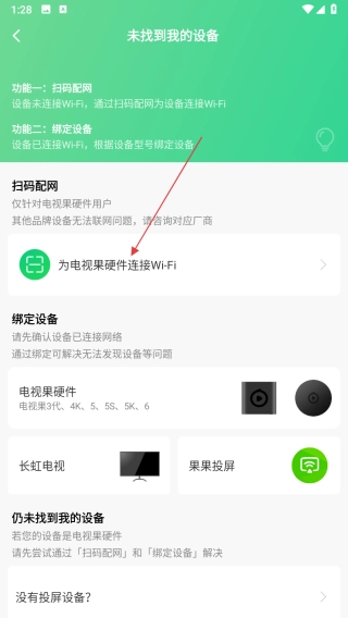 在未找到设备页面,点击为电视果硬件连接Wi-Fi选项,进入为电视果连Wi-Fi的指引页面。