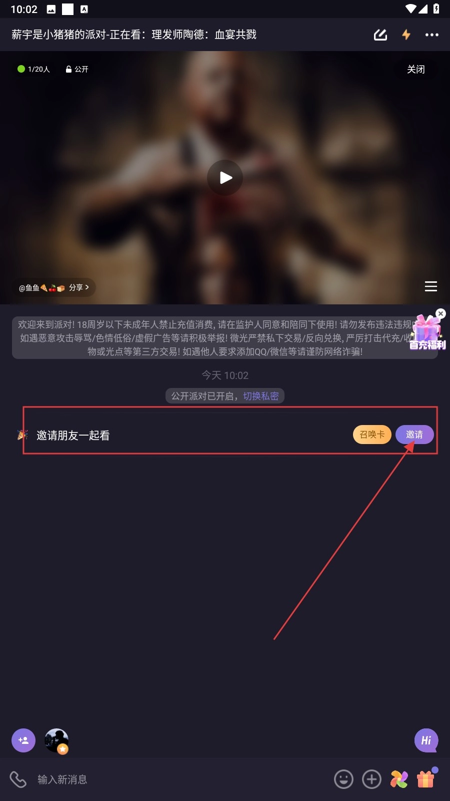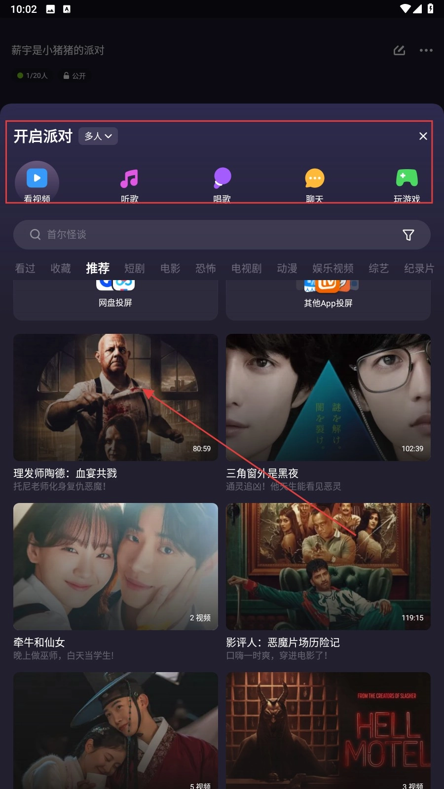在房间里挑选派对类型,像看视频这类,只要点击影片封面就能进入播放界面。