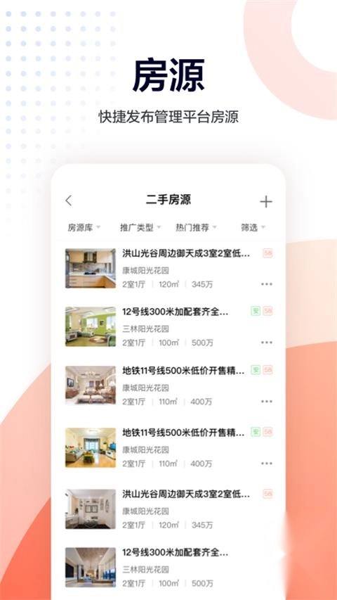 支持二手房、新房、租赁房、商业地产等各类房源的发布与管理。操作便捷易用,房屋开发流程一步到位。配备列表认领功能,经纪人能够跨公司认领房源列表,认领后实现优先展示,从而获取客户的联系机会。