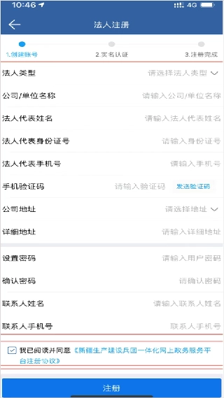进行法人注册时,需填写真实的法人类型、公司或单位名称、法人代表姓名、身份证号、手机号、公司地址、详细地址等信息,以此完成注册流程。