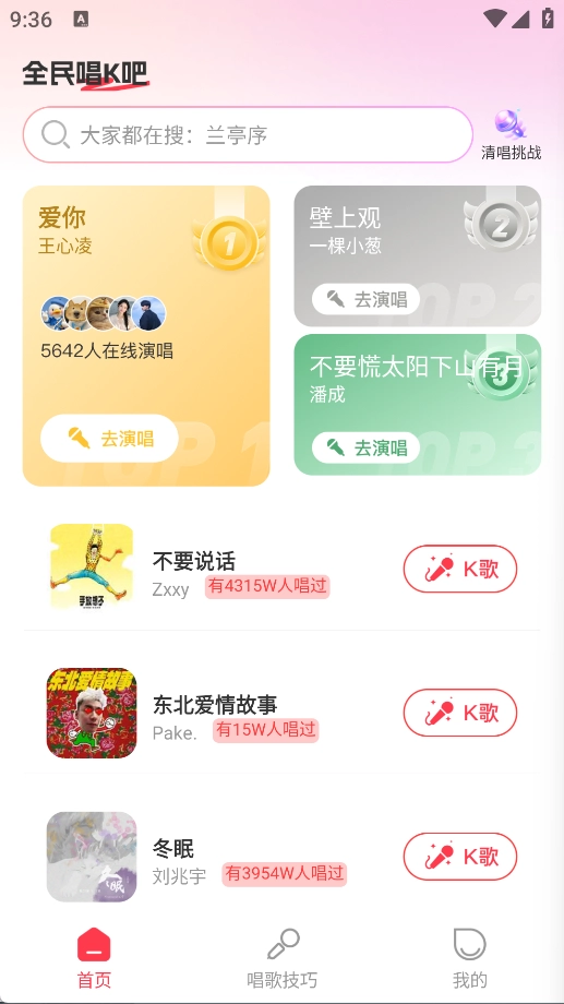首页上有不少不同类型的歌曲,你可以随时去演唱或K歌,也能参与演唱挑战。