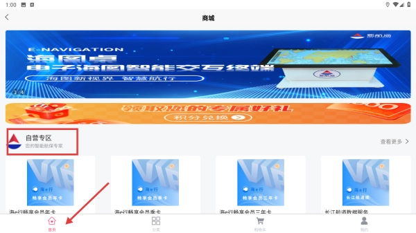 进入首页后,您可以浏览电子海图智能交互终端等宣传内容,还能查看自营专区以及各类海员卡等相关商品。