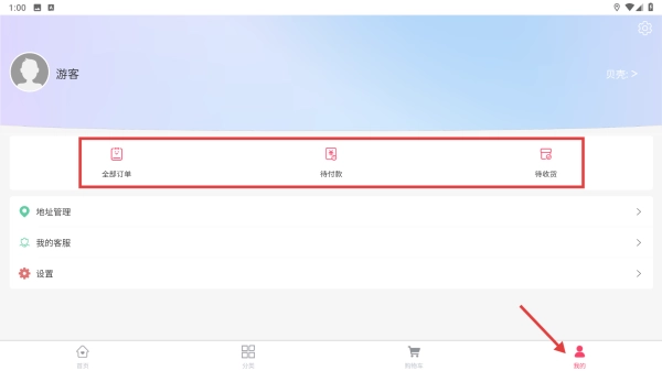 点击“我的”进入个人页面后,你可以查看全部订单、待付款、待收货等各类订单相关信息,同时也能进行地址管理、联系我的客服以及调整设置等操作。