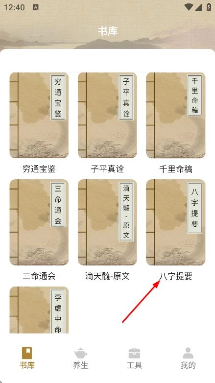 在书库页面,点击带有八字提要的书籍,即可进入该书籍的详情页面。