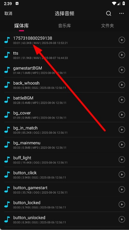 在选择音频页面,从媒体库中选取要剪辑的音频。