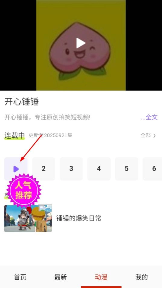 在开心锤锤的详情页面,点击第一集就能开始播放并观看动画了。