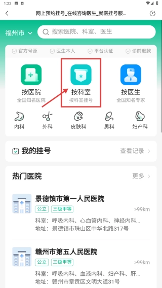在挂号页面,选择按科室挂号的方式,进入科室选择界面。
