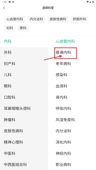 在科室选择页面,点击普通内科科室,进入对应医院列表。