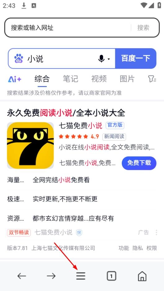 在搜索结果页面,点击底部的菜单按钮,展开功能选项。