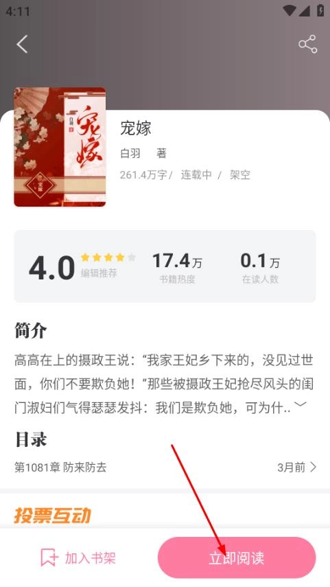 在该书详情页面,点击立即阅读,开始阅读宠嫁。