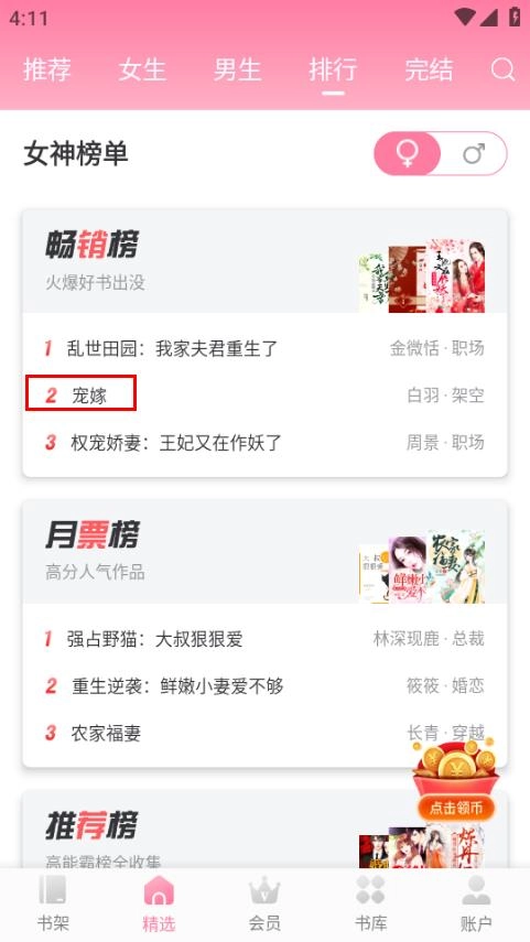 在排行榜页面,找到畅销榜单里的“宠嫁”选项并点击,即可进入畅销榜的宠嫁详情页。