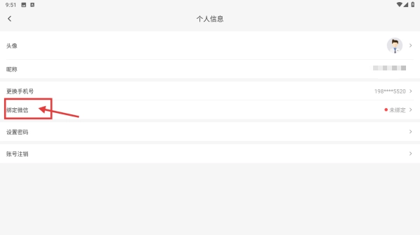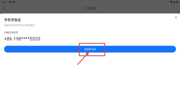 在个人信息页面,点击“绑定微信”选项,即可进入手机号验证界面。