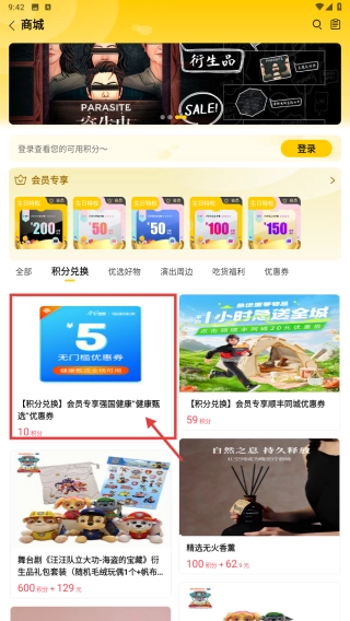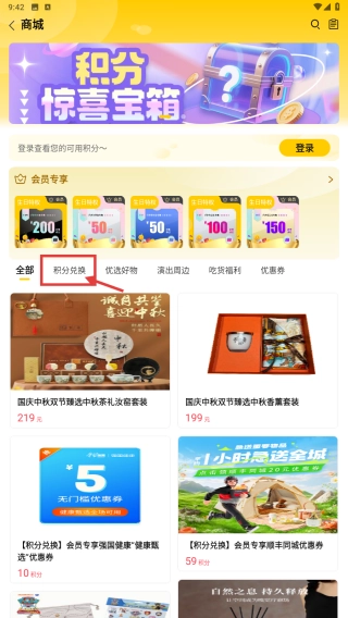 在商城页面,找到积分兑换分类并点击,即可浏览积分兑换商品。