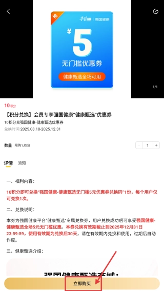 在商品列表中,点击“积分兑换会员专享强国健康甄选优惠券”的条目,即可进入该商品的详情页面。