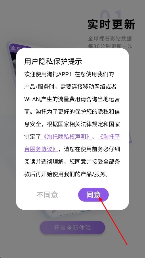 在用户隐私保护提示弹窗里点击同意后,就能进入淘托的登录页面。