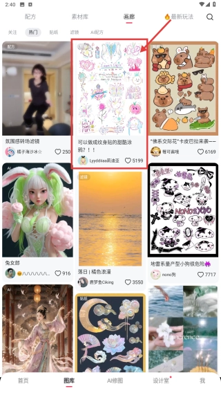 在图库页面,点击画廊分类,浏览图片配方列表。