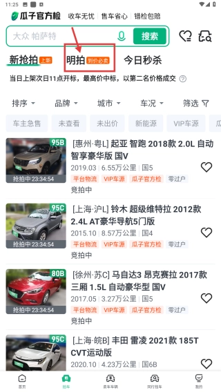 在买车页面,点击明拍分类,浏览明拍车辆列表。