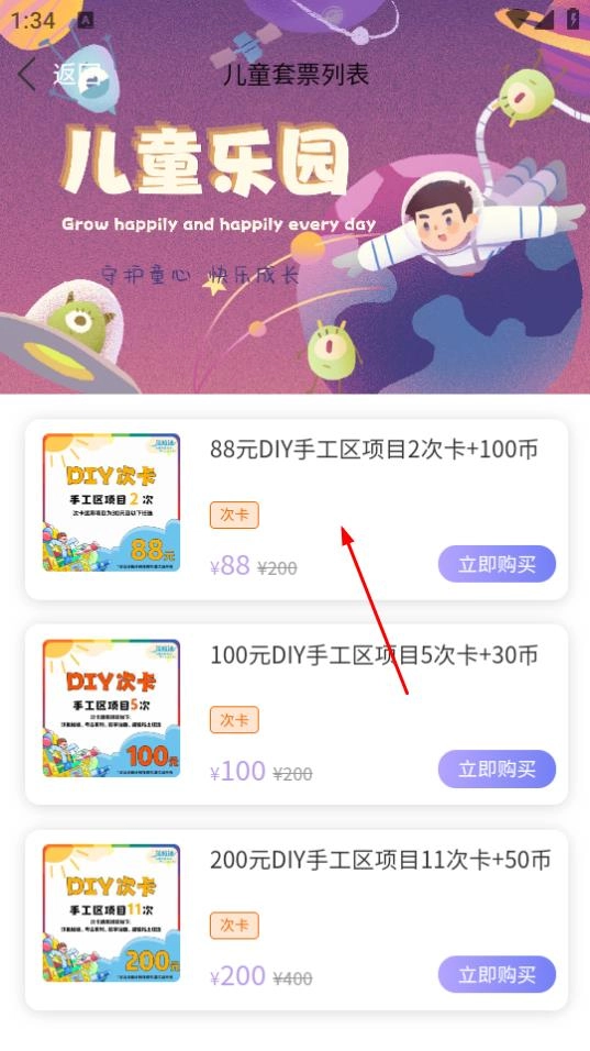 进入儿童套票列表后,挑选心仪的套票,例如88元的DIY手工区套票。