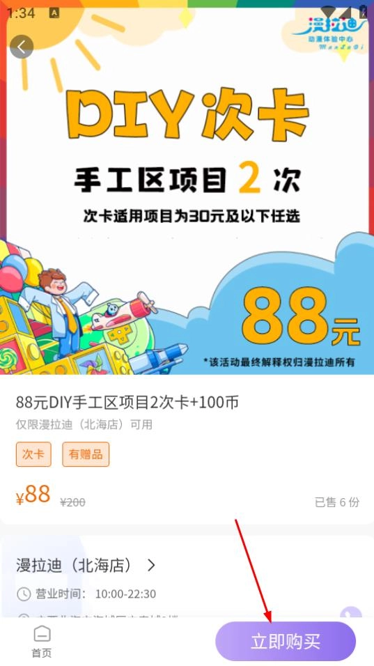 在88元DIY手工区项目2次卡加100币的详情页面,点击立即购买的按钮。