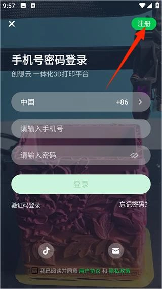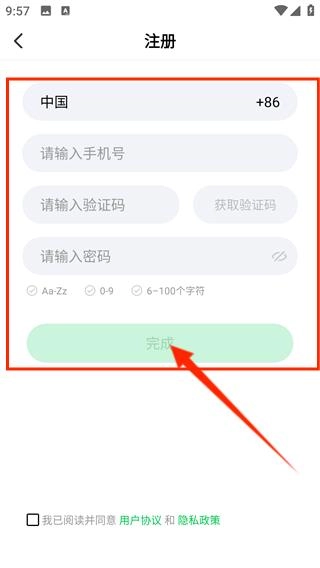 在输入手机号、验证码以及密码之后,点击完成按钮,即可执行注册流程。