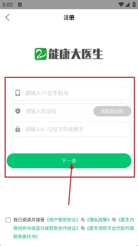 输入手机号、验证码与密码后,点击“下一步”按钮,即可完成注册流程。