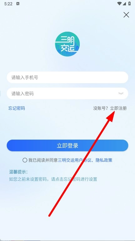 打开三明交运应用,进入用户协议与隐私政策页面后,点击“我同意”按钮。