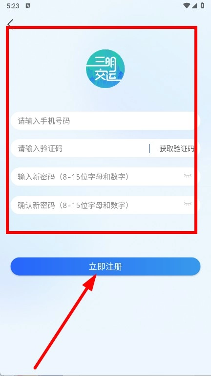 请按顺序填写手机号码、验证码、新密码以及确认新密码,之后点击“立即注册”按钮,即可完成整个注册流程。
