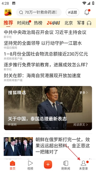 打开搜狐新闻应用,找到页面底部显示“未登录”的区域并点击,即可进入个人页面。