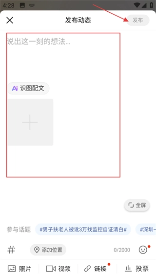 在发布动态的页面输入想法之类的内容后,点击发布按钮就能发布文章了。
