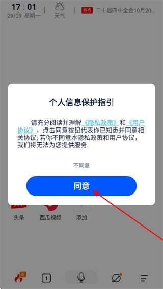 在个人信息保护指引弹窗里,点击同意按钮,即可进入量子浏览器的主页面。