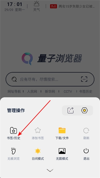 在量子浏览器的主页面上,点击右下角的菜单按钮,即可展开管理操作菜单。