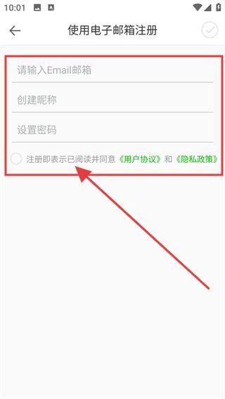 输入电子邮箱、创建用户昵称、设置登录密码,即可完成注册流程。