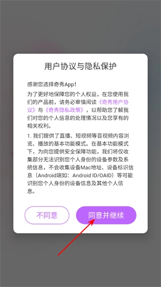 在用户协议与隐私保护弹窗里,点击“同意并继续”按钮,即可进入下一步。