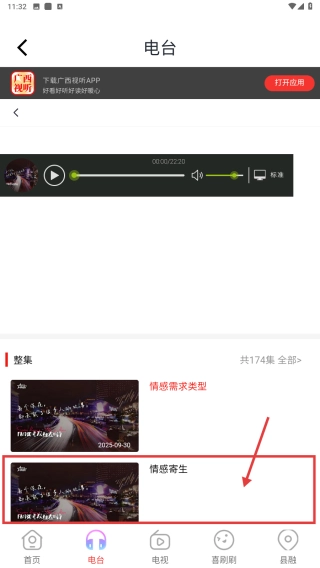打开广西视听应用后,点击底部的电台选项,即可进入电台内容页面。
