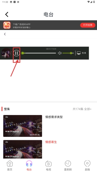 点击播放控制区域的暂停按钮,能够暂停当前正在播放的电台节目。
