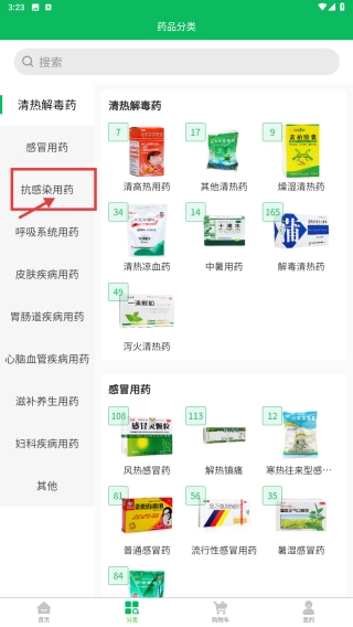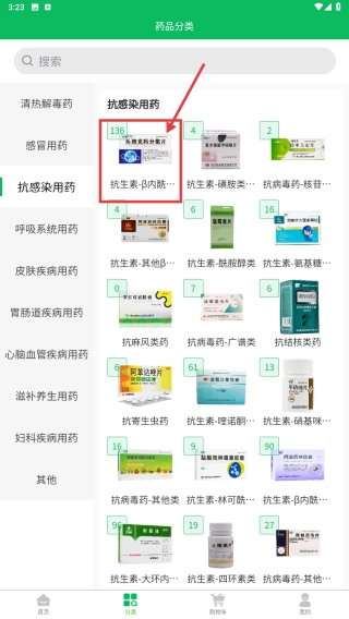 在药品分类页面,选择抗感染用药分类,进入抗感染用药列表页面。