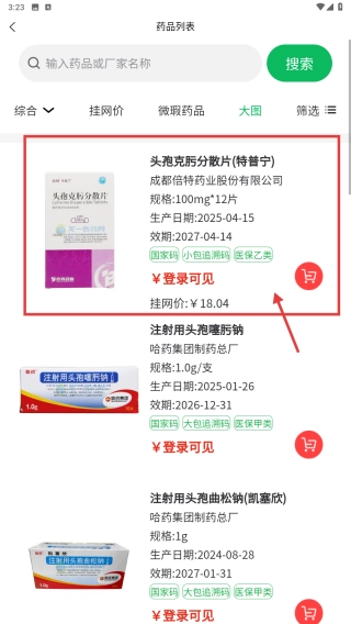 挑选头孢克肟分散片特普宁这一药品条目,进入到药品的详情页面。