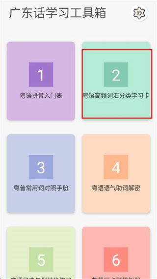 在学习工具箱页面,点击粤语高频词汇分类学习卡,即可进入分类学习卡页面。