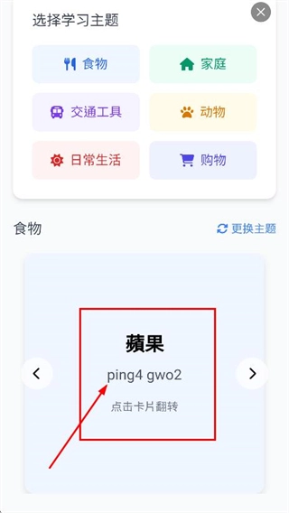 点击卡片,即可翻转查看蘋果的粤语拼音ping4gwo2。