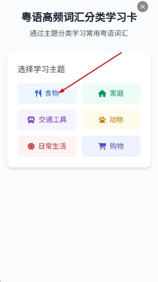 在粤语高频词汇分类学习卡页面,点击学习主题,即可进入对应的主题词汇学习页面。