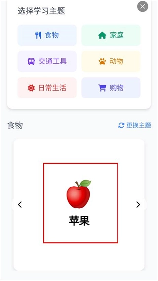 在主题词汇学习页面,可查看词汇苹果的相关展示。