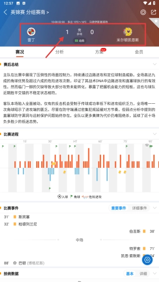 在详情页面,可查看雷丁1-0米尔凯恩斯的赛事比分以及赛事分析等相关内容。